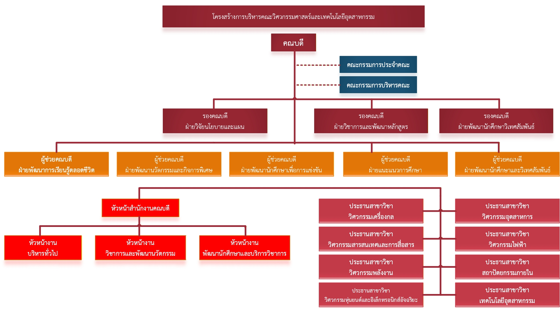 โครงสร้างการบริหาร คณะวิศวกรรมศาสตร์และเทคโนโลยีอุตสาหกรรม มหาวิทยาลัยราชภัฏเพชรบุรี ได้แบ่งโครงสร้างการบริหารออกเป็นลำดับขั้นการบริหาร